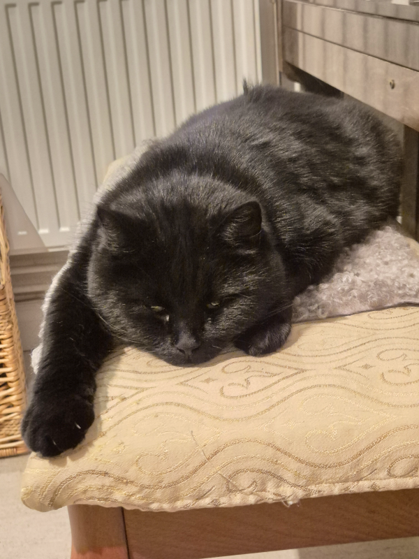 This afternoon, little brother and his sambo dropped by and we played Wingspan. Kalma decided the lid was a great place to sit for a couple of minutes.